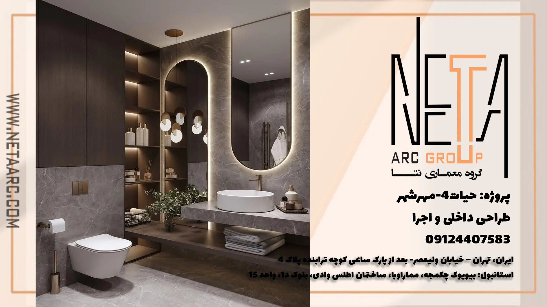 گروه مهندسی نتا، پیشرو و قدرتمند در پروژه های مهندسی طراحی داخلی و دکوراسیون و همچنین طراحی نما ،طراحی انواع ویلاها از کلاسیک تا مدرن و کلیه ی فضاهای اداری و تجاری ، بهترین نتایج را رقم میزند , حتماً ”پروژه ی مسکونی الهیه” را ببینید تا کیفیت و تخصص را در زمینه ی طراحی سرویس بهداشتی ،از نزدیک تجربه کنید!