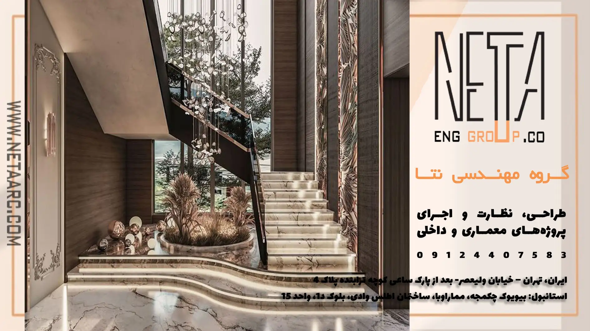 گروه مهندسی نتا، پیشرو و قدرتمند در پروژه های مهندسی طراحی داخلی و دکوراسیون و همچنین طراحی نما ،طراحی انواع ویلا و کلیه ی فضاهای اداری و تجاری ، بهترین نتایج را رقم میزند , حتماً “پروژه ویلای گلستان” را ببینید تا کیفیت و تخصص را در زمینه ی طراحی و مهندسی و همچنین طراحی پله ویلای دوبلکس ،از نزدیک تجربه کنید!